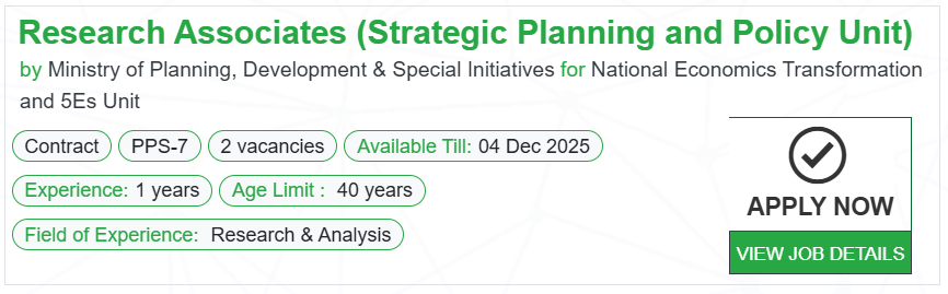 کیا آپ پالیسی سازی اور منصوبہ بندی کے میدان میں اپنی صلاحیتیں بروئے کار لانا چاہتے ہیں؟ پاکستان میں ریسرچ ایسوسی ایٹس (اسٹریٹجک پلاننگ اینڈ پالیسی یونٹ) کی نوکریاں آپ کے لیے ایک بہترین موقع ہیں۔ یہ وہ کردار ہیں جو ملک کے معاشی و سماجی ڈھانچے کو تشکیل دینے میں اہم حصہ ڈالتے ہیں۔ چاہے آپ تازہ ترین سرکاری اشتہار دیکھ رہے ہوں، تنخواہ کے بارے میں جاننا چاہتے ہوں، یا آن لائن درخواست کا طریقہ کار سمجھنا چاہتے ہوں، یہ مضمون آپ کے لیے مکامل رہنمائی فراہم کرے گا۔